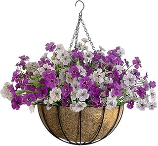Lesrant ハンギングバスケット 人工花付き 12インチ ココファイバーバスケット 人工バイオレット ハンギングバスケット プランターフラワー 屋外パティオガーデンバルコニー装飾用