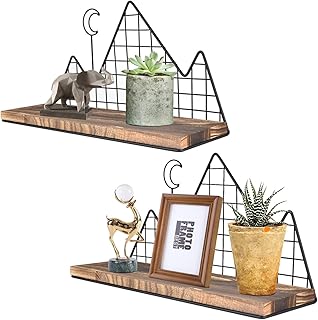 Homode フローティングシェルフ 壁掛け 素朴な木製収納棚 ディスプレイラック 子供部屋 寝室 バスルーム キッチン オフィス マウンテンメタルワイヤーデザイン