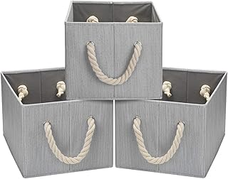 Robuy 3パック 折りたたみ可能な収納ボックス 竹生地 長方形オーガナイザー コットンロープハンドル付き 布製シェルフバスケット 折りたたみ式ボックスオーガナイザー 棚/クローゼットなどに グレー 14.4x10x9.8インチ