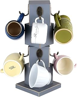 木製ファームハウス コーヒーマグスタンド ソリッドコーヒーカップホルダー 素朴な木製カップマグツリー カウンター用 コーヒーバーラック 8個用 グレー