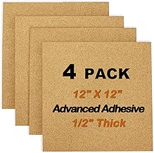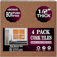 コルクボードタイル 12インチ x 12インチ - 厚さ1/2インチ - ボックスボーナスプッシュピン - 超強力粘着裏地 - コルクタイル4枚 - 掲示板 - ミニ壁 4pack